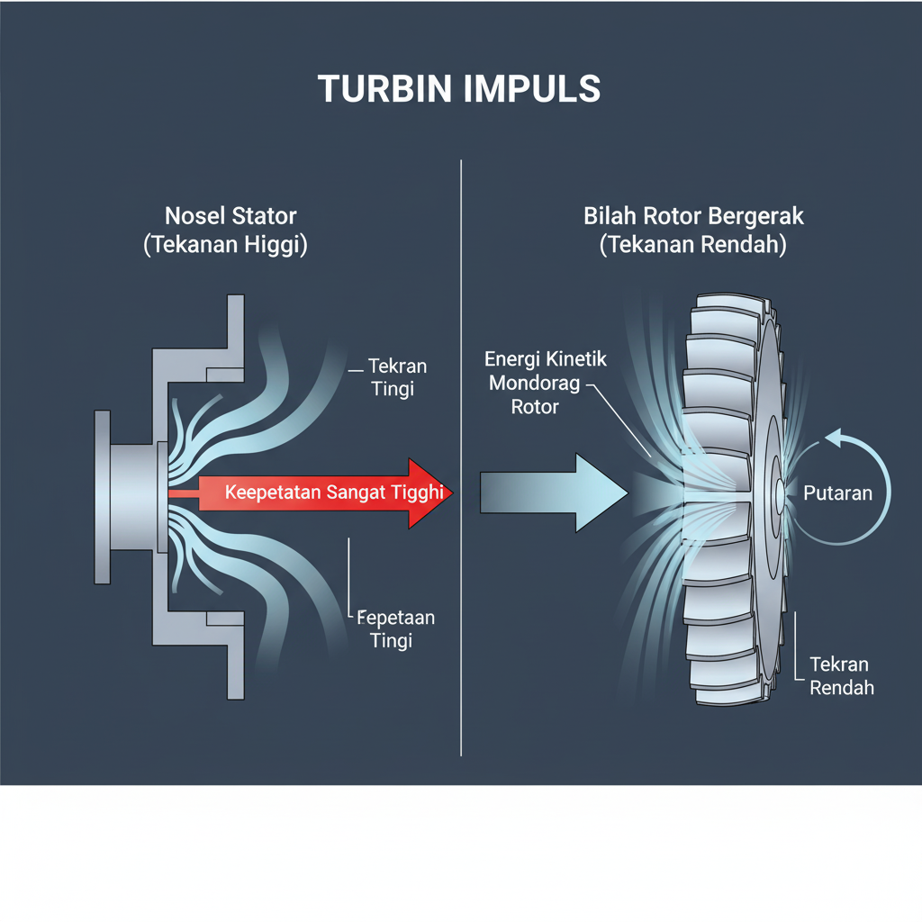 - Turbin Impuls: Turbin ini bekerja dengan mengubah kecepatan uap menjadi energi kinetik, yang kemudian ditransfer ke bilah-bilah turbin. Semua penurunan tekanan terjadi di nosel, bukan pada bilah.