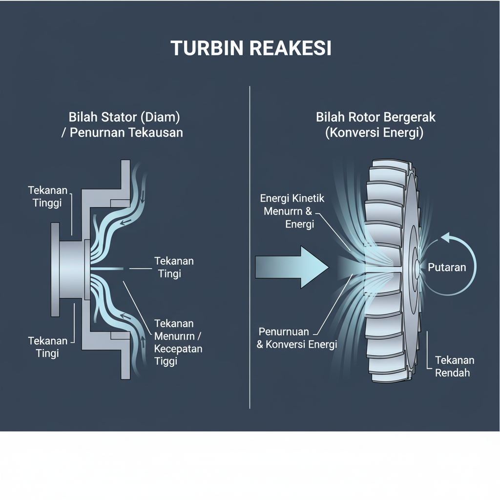 - Turbin Reaksi: Turbin ini mengubah energi tekanan dan energi kinetik uap secara bertahap pada setiap tingkat bilah. Penurunan tekanan terjadi secara merata di sepanjang bilah stator (diam) dan rotor (bergerak). Turbin jenis ini lebih efisien dan umum digunakan dalam aplikasi industri skala besar.