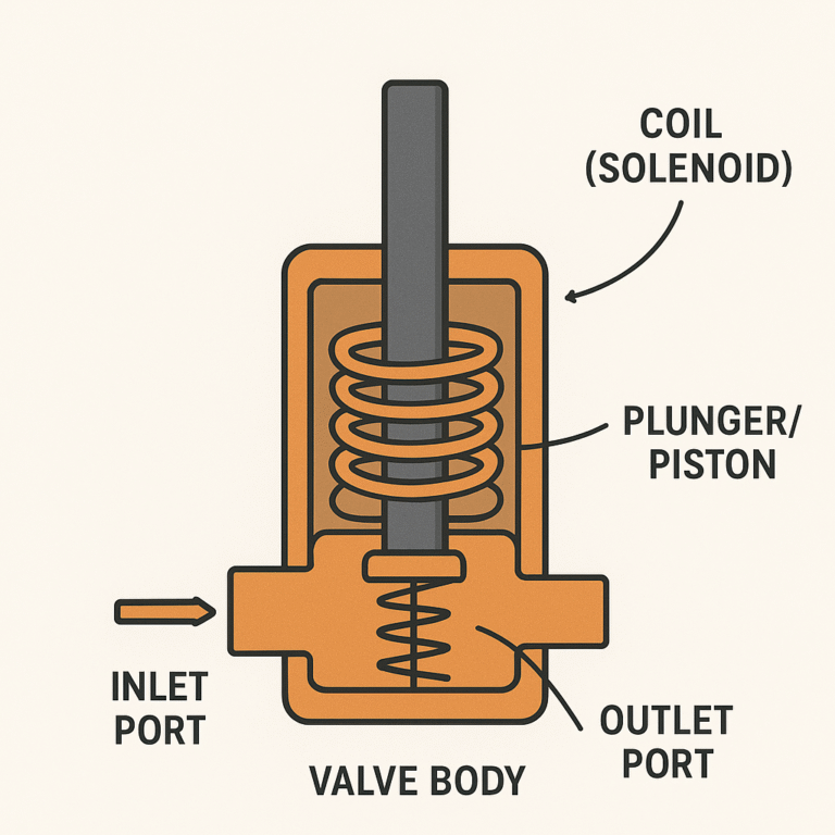 Coil (Solenoid) → menghasilkan medan magnet. Plunger / Piston → batang logam yang bergerak. Badan katup (Valve Body) → tempat aliran fluida. Inlet dan Outlet Port → jalur masuk dan keluar fluida. Spring → mengembalikan posisi katup saat tidak aktif.